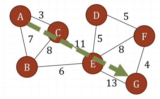 The Heuristic (green line) has found the geometrically closest rout from A to G, ignoring weighting at this stage.